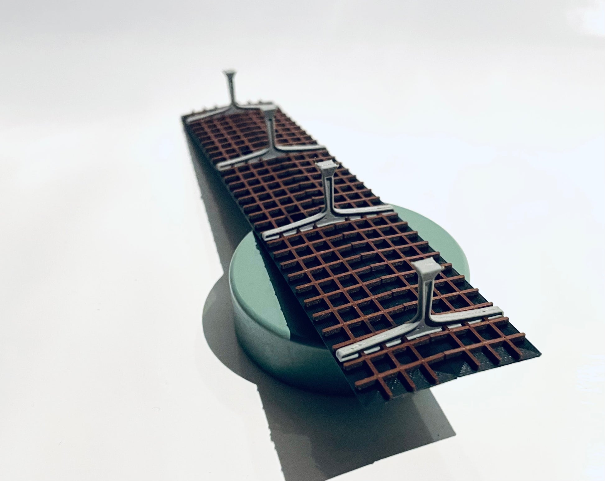 Unsere Bahnsteige werden in matt-grauem, braunem und matt-schwarzem PLA+ Kunststoff im FDM 3D-Druckverfahren hergestellt. Druckmuster sind sichtbar.