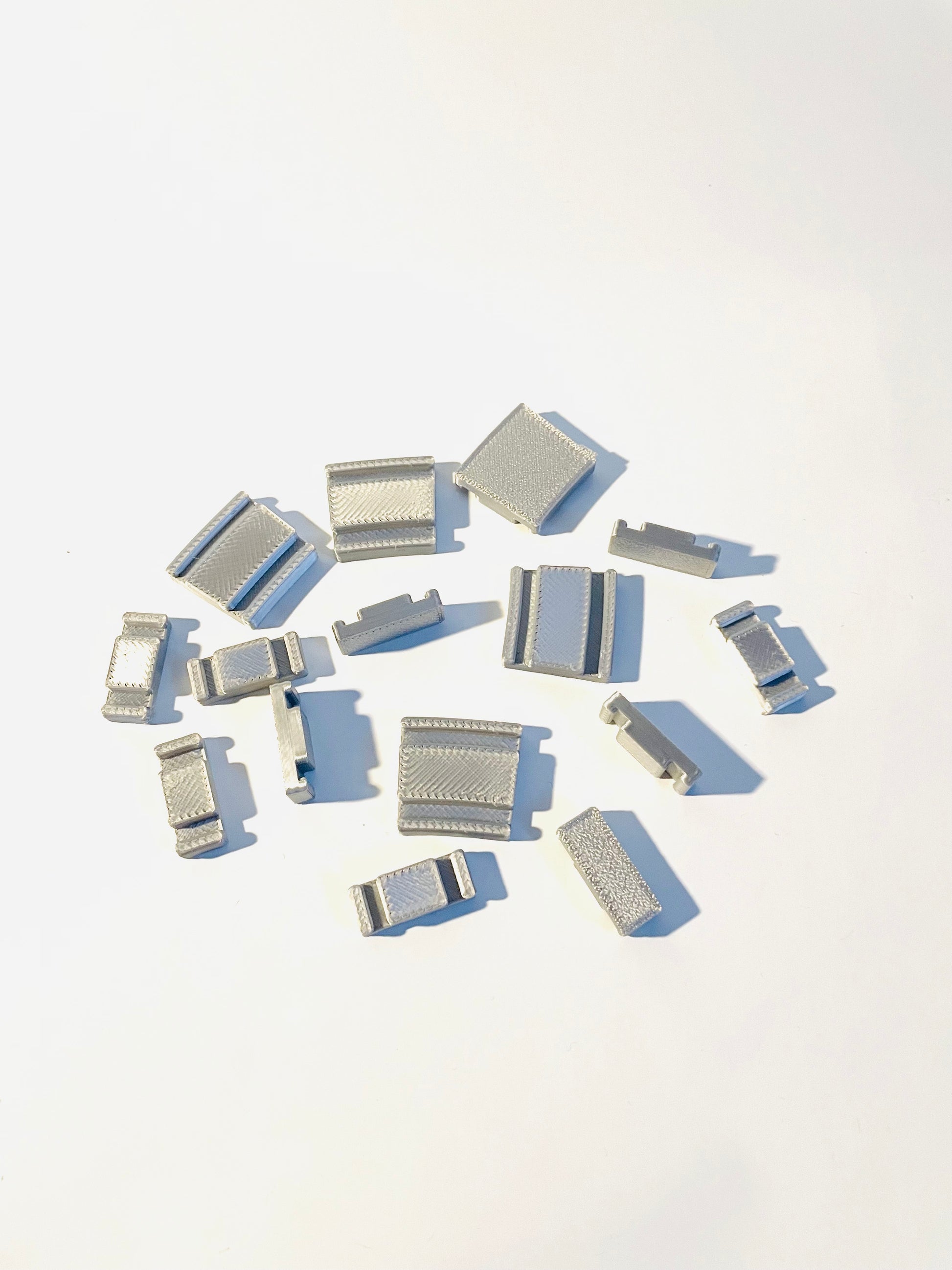 Unsere Gleisabstandshalter werden aus farbigem PLA+ Kunststoff im FDM 3D-Druckverfahren hergestellt. Druckmuster sind sichtbar.